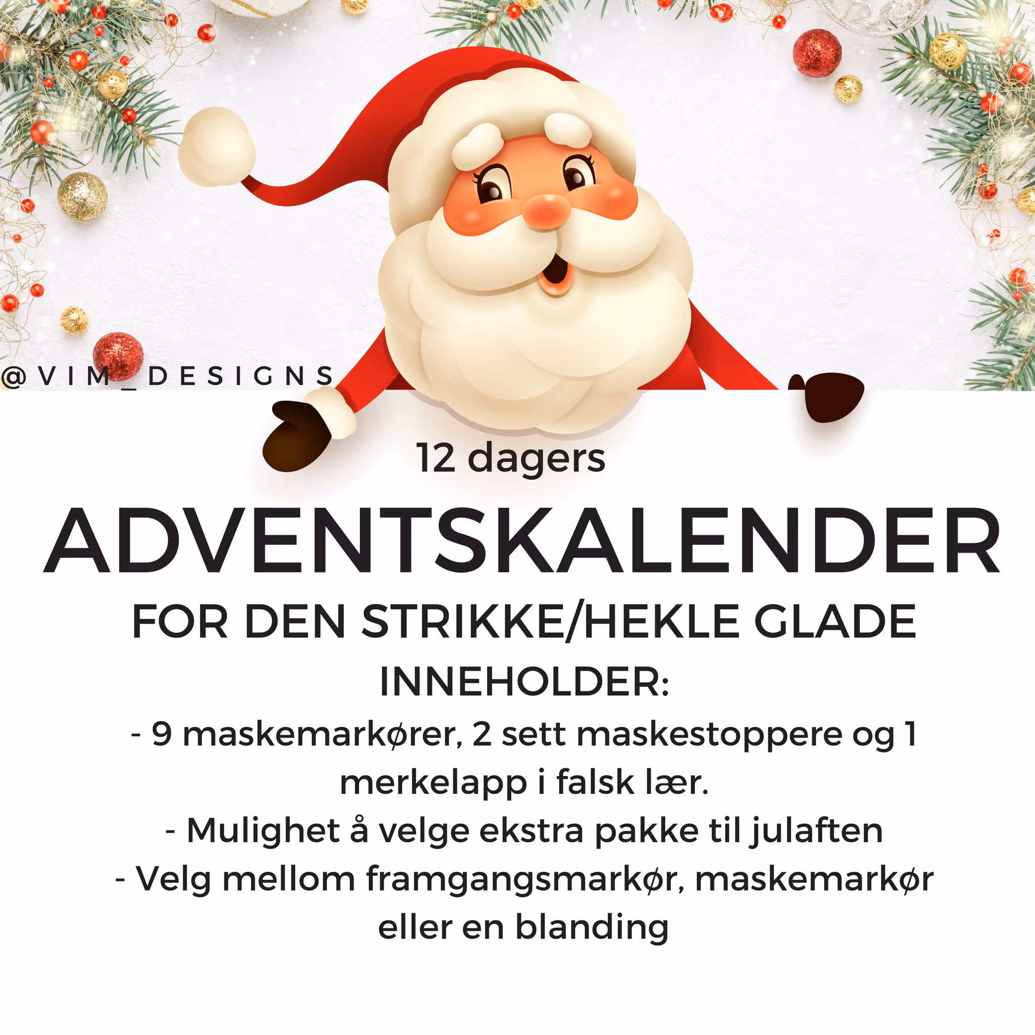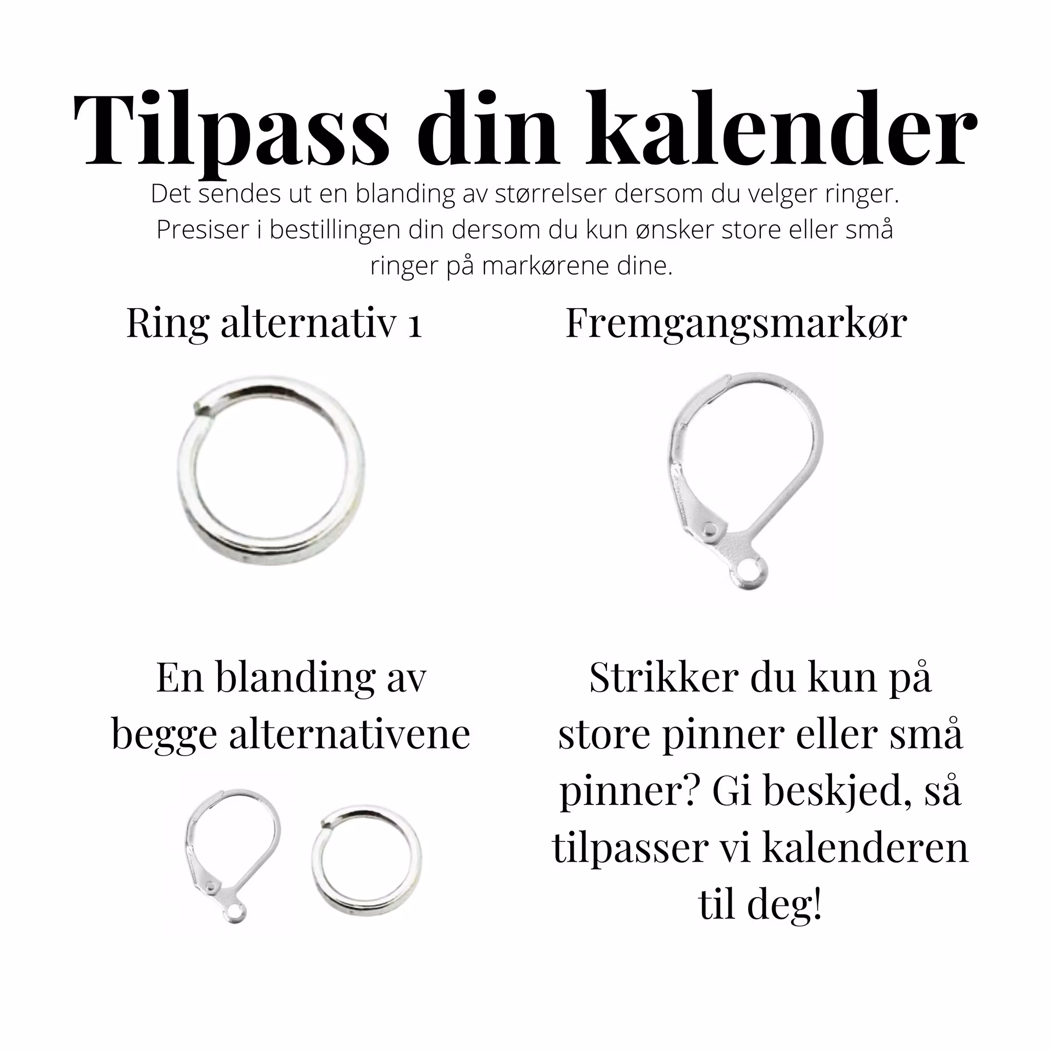 Du velger selv om du vil ha maskemarkører, fremgangsmarkører eller en blanding. Hvis du kun strikker med store pinner eller store pinner, kan vi tilpasse kalenderen slik at den passer perfekt til deg! Legg ved en kommentar til din bestilling eller send oss en melding!