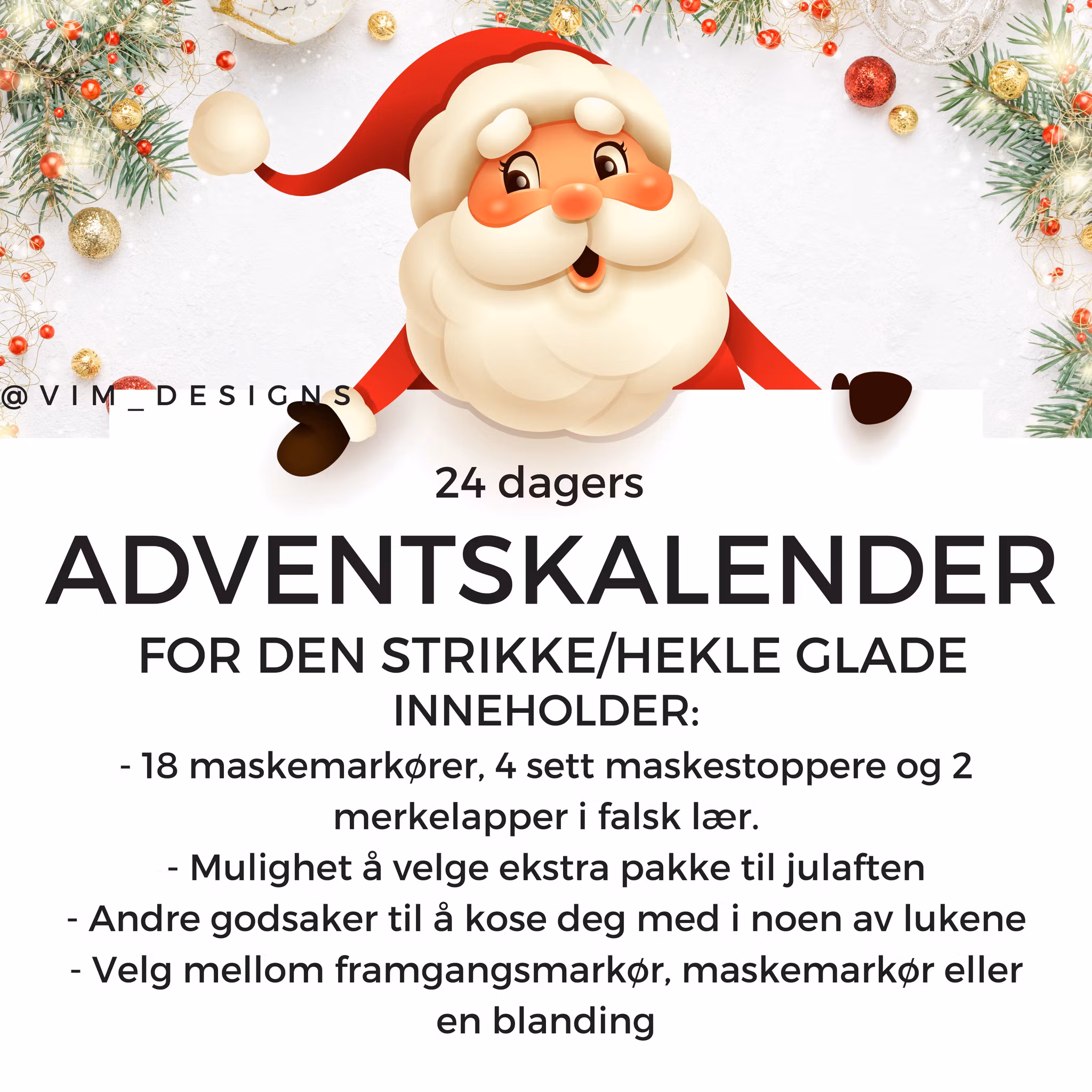 I år har vi kalenderen i to ulike varianter. Den ene inneholder maskemarkører fra Disney, Pokemon og andre filmer og spill. Den andre kalenderen er en kalender med mer generelle motiver som f.eks. en julenisse, blomster, dyr, planter etc. Det er også mulighet å velge mellom standard kalender med 24 luker eller en litt mindre variant med 12 luker.